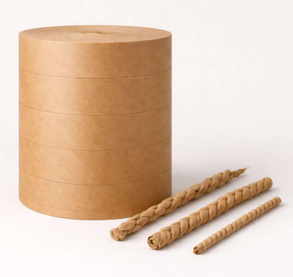 En FEELCOM ofrecemos Papel Kraft Natural de alto desempeño, desarrollado especialmente para procesos de twisting o torcido, ideal para la fabricación de asas de papel para bolsas, cordones, amarres y aplicaciones industriales que requieren alta resistencia y uniformidad.